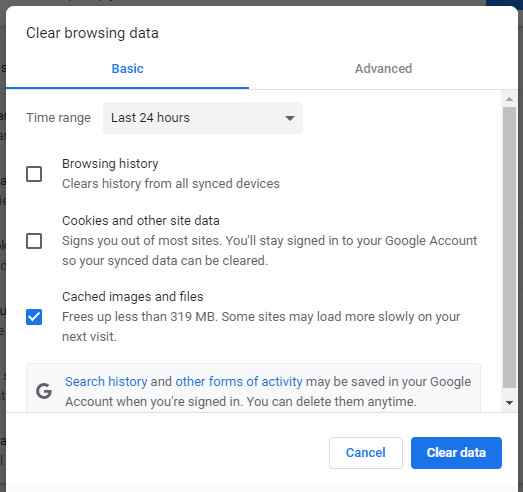 Make sure only the "Cached images and files" option is selected and click "Clear Data". Then, reload the browser tab.